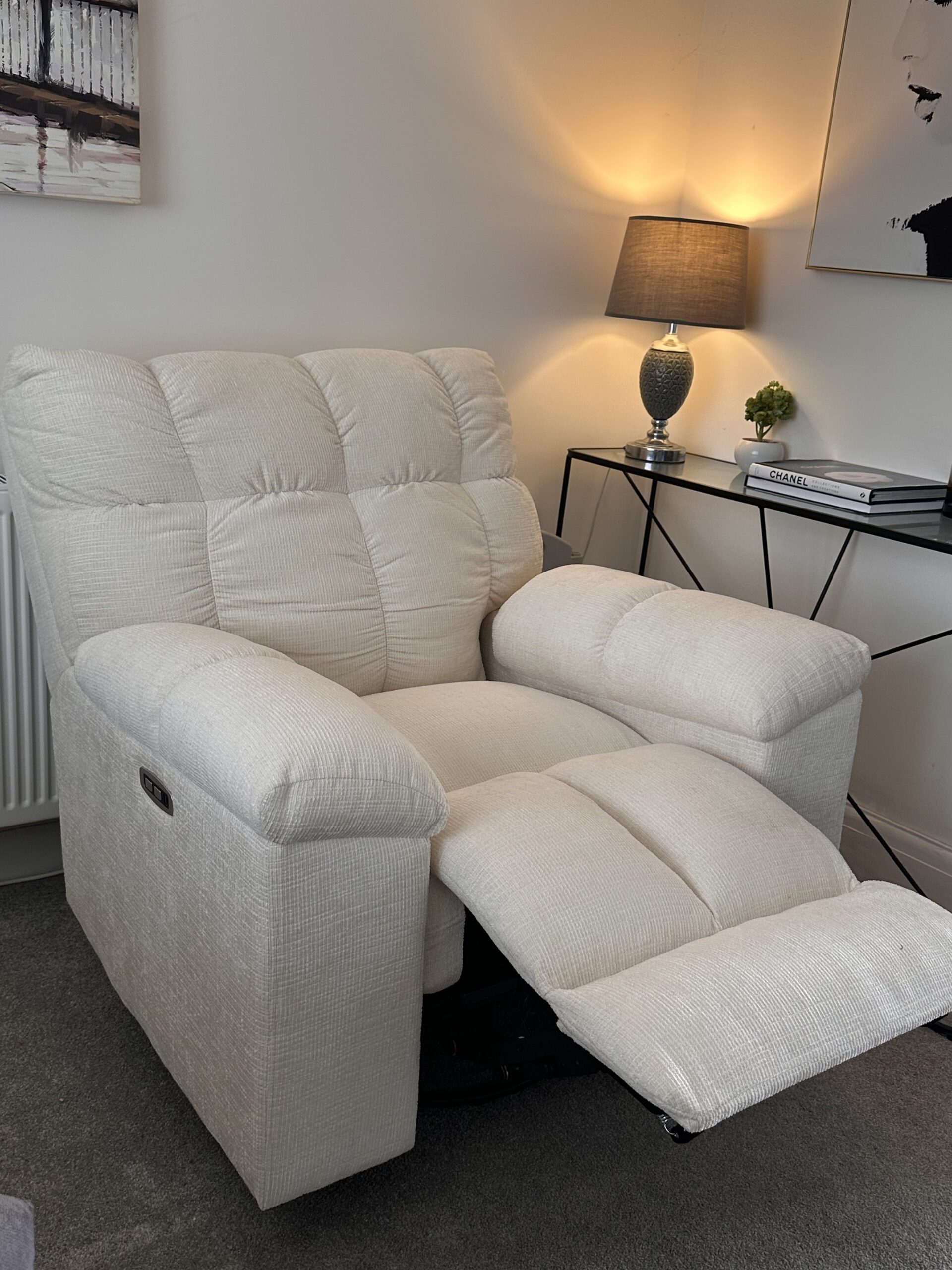 So, a couple of weeks ago, I finally got my hands on the Vanilla Cream Power Swivel Rocker Recliner with Waffle Back from FlexiSpot.