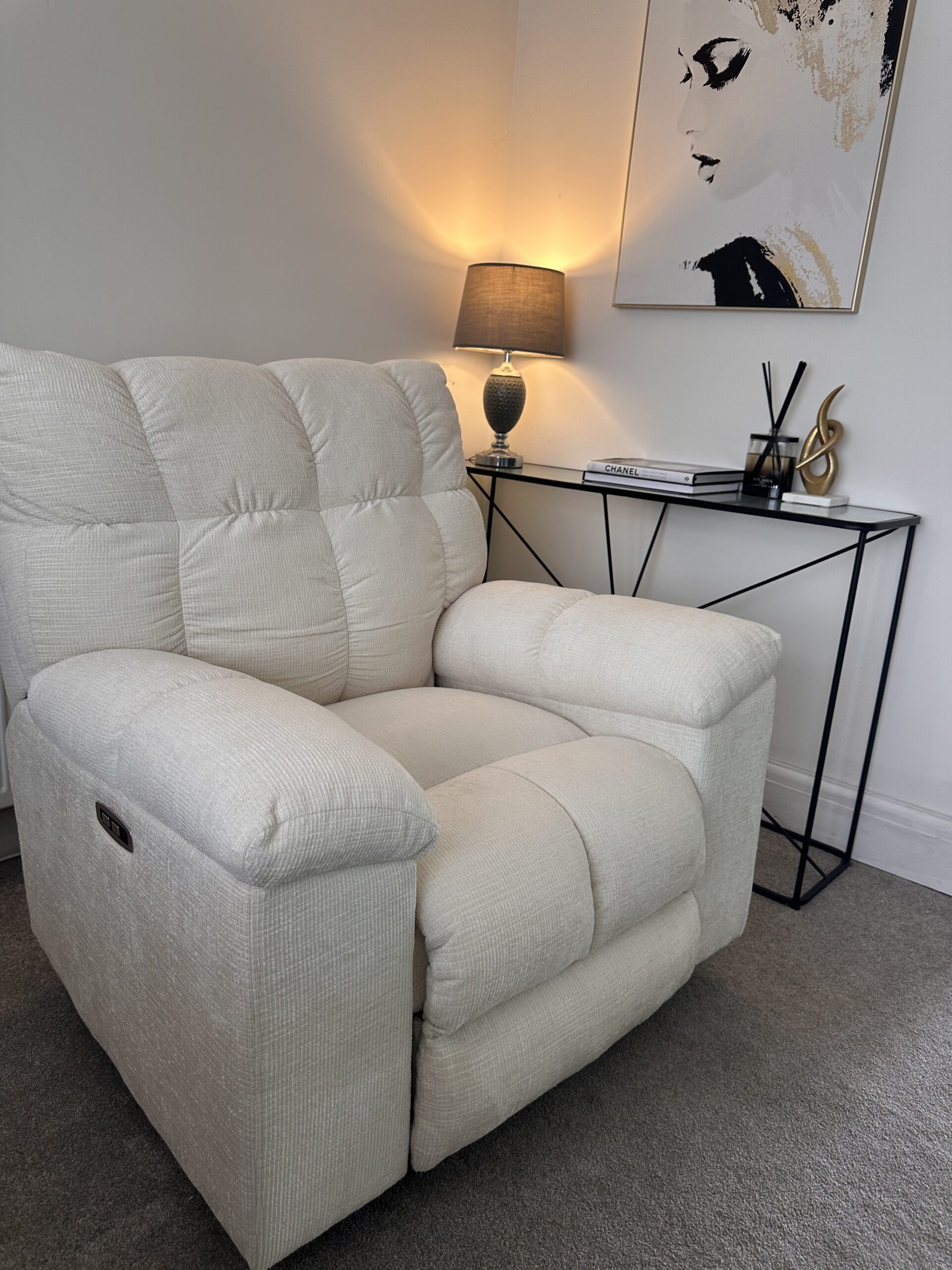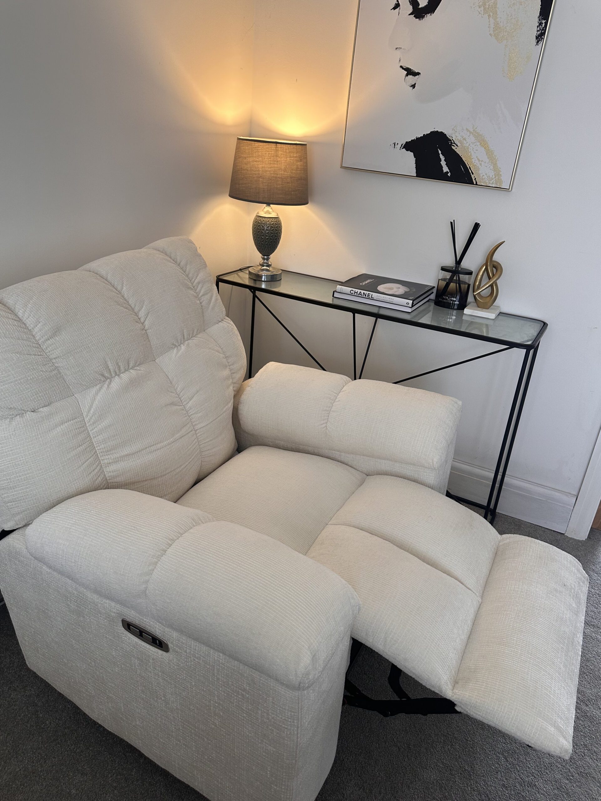 The recliner button is within reach (by the side of the chair), making it easy to reposition. Honestly, this chair just elevates whatever space you put it in. Plus, the fabric is super soft.